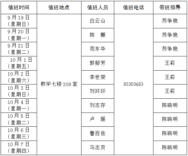 2.值班期间如遇有紧急、重要事项或突发事件,应立即联系带班领导并向学校总值班室(校务楼110室,85310005)报告并妥善处置;